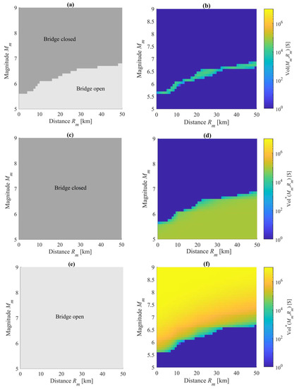 The results of the VoI analysis for different decision scenarios are shown in Figure 5. In particular, Figure 5a displays the results of the Prior analysis according to risk considerations, i.e., the optimal action is the one corresponding to minimum expected costs (minimum risk) according to the epicentral distance and magnitude of the mainshock (Scenario 1). The bridge should be closed for a mainshock of relatively high magnitude and/or short epicentral distance (north-left corner). Otherwise, it should not be closed to traffic (south-right corner). The corresponding VoI is shown in Figure 5b. The VoI is at the maximum in correspondence with the boundary between the optimal actions in Figure 5a, which is when the two actions have similar expected costs during the Prior analysis.