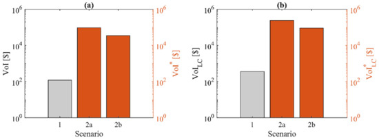 Figure 6 shows the VoI and the life-cycle VoI computed considering the parameters specified in Section 4.2. In Figure 6a, the lowest VoI is quantified for Scenario 1, due to the relatively small conditional VoI displayed in Figure 5b. Even if the highest values of the conditional VoI are reached in Scenario 2b (see Figure 5f), the highest expected VoI is obtained for Scenario 2a. This is due to the PDF of the and . For instance, presents a truncated exponential distribution, which associates high probabilities to small values of magnitude. In turn, in Scenario 2a, low magnitudes are linked to relatively high values of the VoI. In Scenario 2b, low magnitudes are linked to null values of the VoI. Thereby, the expected VoI is higher in the case of Scenario 2a. The life-cycle VoI values shown in Figure 6b for the three scenarios are similar to the corresponding VoI values due to the low expected number of earthquakes in one year in the seismic area ().