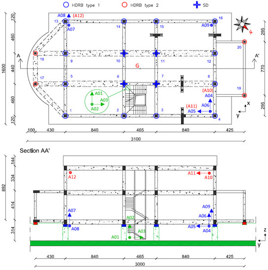 First floor with isolation system and vertical section, with the accelerometers deployment.