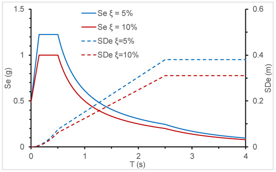 Acceleration spectra (continuous line) and displacement spectra (dotted line) at the ULS.