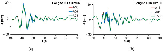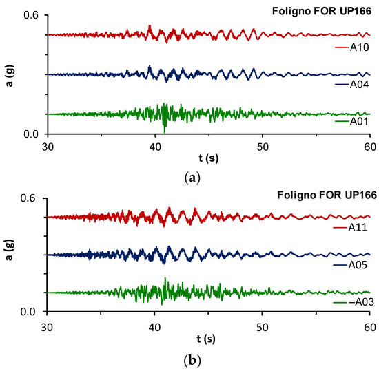 The 30 October 2016 Norcia earthquake was the event with the maximum magnitude in the sequence, but also the event that induced the maximum effects at the site of the building. In Figure 5 the acceleration time histories recorded in x and y direction, respectively, at the basement L0 (A01 and A03), at the first floor above the isolation interface L1 (A04 and A05) and at the top of the building L2 (A10 and A11) are plotted. The peaks of the acceleration, for the same levels, are PBA = 0.098 g, PIA = 0.054 g and PTA = 0.059 g, respectively. The absence of amplification from the basement to the top, which characterizes isolated structures, is clearly recognizable. On the contrary, there is a reduction in acceleration between the basement (L0) and the first floor above the isolation system (L1).