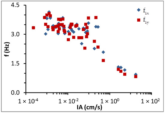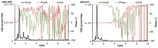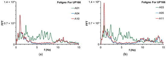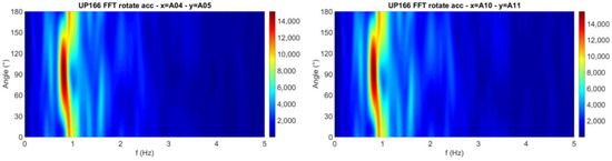 The Fourier spectra for the horizontal sensors are plotted in Figure 6. The sensors in the same direction, deployed in the superstructure, show a peak of amplitude for the same frequency, equal to 0.95 Hz in x direction and 0.81 Hz in y direction. These resonance frequencies are much lower than the resonance frequencies recorded under ambient vibrations and related to the superstructure. The spectrum rotates of the recordings obtained at the couples A04–A05 and A10–A11 confirmed the presence of two different frequencies along the two main directions (Figure 7).