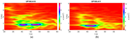 The presence of two different resonance frequencies in the two directions could be related to a non-perfect symmetry of the isolation system. The wavelet transforms [30], plotted in Figure 8 for sensors A10 and A11, show that the dominant frequencies vary during the seismic event and the frequencies related to the isolation system are particularly evident only during a small portion of the time histories. One can deduce that the resonance frequencies changed during the earthquake and that the isolation system did not work for the entire recording. These occurrences justify the presence of more peaks in the spectra around the resonance frequency. Furthermore, between 46 s and 50 s, vibrations prevail in x direction.
