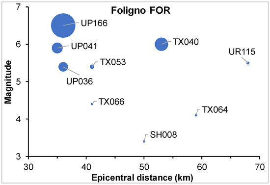 The permanent monitoring system recorded all the seismic events that struck Central Italy between August 2016 and January 2017. Among these only the most representative earthquakes were chosen to analyze the behavior of the building. The features of the selected earthquakes are summarized in Table 2, where IA represents the Arias intensity at the base of the structure, obtained by the formula (, and are the accelerations in the three directions at the basement of the building recorded between the initial time ti and the final time tf of the event) [29]: