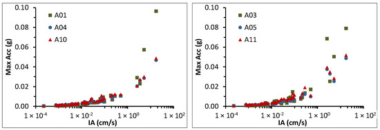 In Figure 14, the maximum accelerations in x and y direction occurred at L0 (A01 and A03), L1 (A04 and A05) and L2 (A10 and A11), respectively, and are plotted versus IA for all the recorded seismic events. Both the horizontal components of the accelerations at the three levels increase with IA. The acceleration at the basement (PBA) is not always greater than the acceleration at L1 and L2, as shown also in Figure 15, where the maximum accelerations, obtained as vector sum of the components along x and y, are shown. However, the structural amplification in these cases is quite low. It is worth pointing out also that PBA does not always increase with IA. In some cases, this occurrence can be justified by means of IA/D ratio (UP036, see Table 2), in other cases by the presence of a very high peak in the acceleration time history.