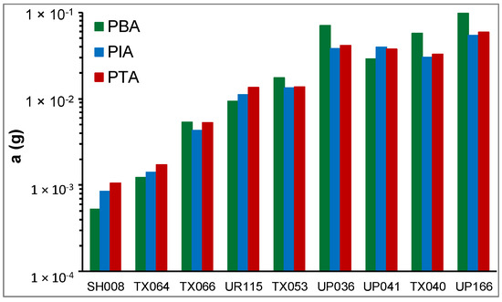 Maximum absolute acceleration at the basement PBA, above the isolation system PIA and at the top of the building PTA for the selected seismic events.