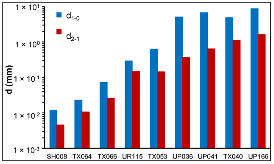 In Figure 16 and Figure 17, the maximum absolute displacements at the three levels and the relative displacements d1-0, between the gravity centers of L1 and L0, and d2-1, between the gravity centers of L2 and L1, are shown in increasing order of IA. The displacement at the basement does not increase always with IA and the maximum displacement does not occur always at the top of the building. As already pointed out, this occurrence can be justified with a different D or the presence of a very high peak in the time history. Instead, the relative displacement d1-0 is always higher than d2-1, also for the lowest energy earthquakes. Acceleration and displacement values are synthesized in Table 4.
