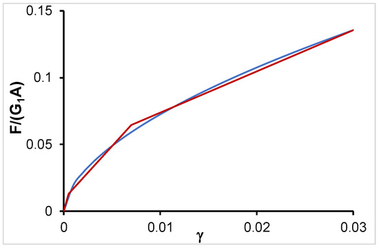 For this purpose, a non-linear constitutive law was assumed for the hysteretic isolators that simulate the elastomeric devices. It is represented by Equation (4) and was approximated by a trilinear curve (Figure 20). The approximation was made to match Equation (4) in the range of small shear strain (0–0.03), which was of interest for the observed results during Norcia earthquake.