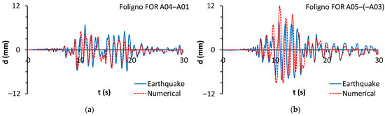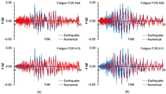The results of the dynamic numerical analysis were compared to the seismic behavior observed during the Norcia earthquake. The good agreement between the acceleration time histories is apparent (Figure 21). Little discrepancies in terms of amplitudes can be attributed to a little lower stiffness of the numerical model with respect to the real structure. For the same reason the numerical displacement peaks are a little higher than those recorded during the earthquake (Figure 22). However, the frequency content of the recordings obtained during the event is well reproduced by the numerical model, as both the acceleration and displacement time histories show.