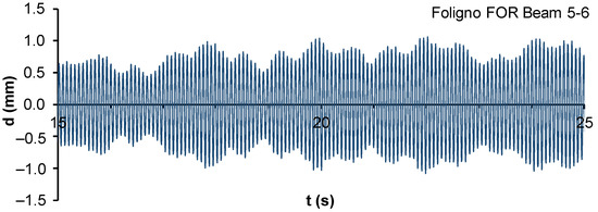 As already said, some crack patterns were observed on the partition walls of the first floor after the main event of 30 October 2016. In order to investigate this aspect, the relative displacements between the lower and upper beams were analyzed. It can be seen that an excursion greater than 2.0 mm around the value under vertical loads with a high frequency content, which occurred during the quake, can justify the cracks (Figure 23).