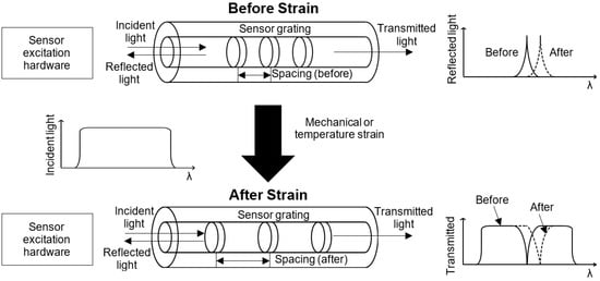 There are two main types of fiber optic sensors for measuring strain: distributed sensors, e.g., [13,19] and discrete sensors using fiber Bragg gratings, e.g., [12], which are the focus of this study. Figure 1 shows how a fiber Bragg grating sensor works. In a fiber Bragg grating sensor, the core of the fiber is etched so that selected wavelengths of light are reflected, and other wavelengths are transmitted. When the fiber is subjected to strain, the spacing of the Bragg gratings change. This change in spacing causes a shift in the reflected wavelength. The change in wavelength can then be correlated to the applied strain.