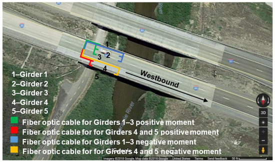An overlay of the fiber optic cable lines and the bridge is shown in Figure 4. The river below the bridge prevented access to the inner span from the ground. Therefore, only the outer span was instrumented. Four fiber cables were installed: two cables with six sensors multiplexed and secured to Girders 1–3 and two cables with four sensors multiplexed and secured to Girders 4 and 5. It was decided to have two sensors per girder. The sensor excitation hardware used in this study can accommodate up to 25 sensors per cable.