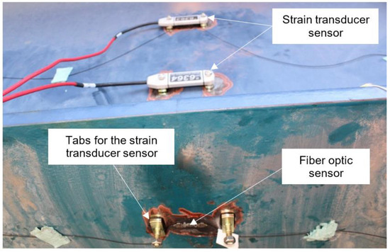 Location of the fiber optic and strain transducer sensors on a girder.