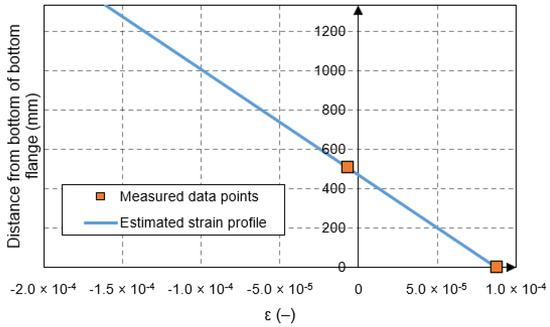 The strain profile of each girder was determined by identifying the time that the maximum peak strain occurred. The corresponding measured strains were used to calculate the internal stresses and forces in each girder. The process for postprocessing of strain data is described in [37]. During this process, it was observed that the computed neutral axis based on the sensor data was lower than the non-composite neutral axis for sensors located on the web at the same location as a transverse stiffener. This was observed even for data that corresponded to the time when the vehicle was immediately above the girder. For example, Figure 6 shows a representative strain profile at the transverse stiffener location. The figure shows that the computed neutral axis was below the fiber optic sensor that was mounted on the web 508 mm (20 in.) above the bottom surface of the bottom flange, whereas the non-composite neutral axis calculated based on the properties in Table 1 was located at 667 mm (26.3 in.) above the bottom flange. The lower location of the neutral axis at the stiffener matched that observed in [38]. As a result, the data from sensors mounted on the web at the stiffener locations were not used. To compensate for the loss of the strain data on the web at stiffener locations, the neutral axis was computed based on a full composite action between the girder and the bridge deck. This approach was considered reasonable because the loading was within the linear elastic region, and prior studies indicated that in the elastic range the bond and friction between deck and girders was maintained [39]. The implications of this approach are discussed in [40].