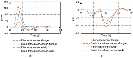 In comparison to the strain transducer sensor data, the strain histories obtained by the fiber optics system matched for girders close to the load point. The average difference for all the available sensor data for the bottom flange of the steel girders in comparison to the strain transducer data was 7%. Figure 7 shows a comparison of the fiber optic and strain transducers’ strain histories for a representative girder and run. The fiber optic sensors measured a slightly smaller strain compared to the strain transducer sensors (approximately 13 µε and 8 µε at the positive and negative moment locations, respectively). The difference between the data was consistent with results obtained in laboratory experiments [34]. Aside from aleatoric sources, the difference was attributed to two factors: first, the gage factor depends on the temperature and the thermal expansion coefficient of the host material, but the actual condition of the host material (steel) was not assessed; second, there was a lag between the fiber optic sensor response and the strain transducer sensor response (e.g., at the positive moment location).