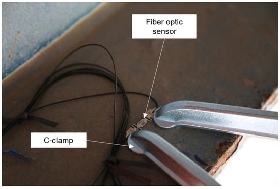 Prior to installing the fiber optic system, the elastic neutral axis of the girders was determined by installing strain transducer sensors, conducting a diagnostic field test, and then removing the sensors. The fiber optic system was afterwards installed on each girder at the positive moment location. The fiber optic strain sensor was mounted to the top surface of the bottom flange using a C-clamp. Two C-clamps were used for each sensor, as shown in Figure 10. The C-clamps were attached to the end of the sensor casing to avoid pinching the fiber optic line.
