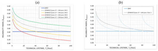 Reliability is typically understood as the property of a system’s reliability (multiple-failure modes) but also that of a component’s reliability (single-failure mode) at a specific point in time. However, rational concepts need to accommodate life-cycle effects, such as the natural deterioration of materials, extreme events and alterations in human activities and environmental conditions, in long-term considerations [9]. These aspects are particularly governed by uncertainties, where probability-based concepts also find a more efficient implementation. In such cases, the reliability verification of a structure should be related to the structure’s service life and failure is associated with two types of events, (a) first peak value beyond an action threshold and (b) the accumulation of propagating damage beyond a resistance threshold. These can be described with time-variant input variables. Consequently, the accepted (target) reliability threshold is also dependent on the lifetime interval under consideration. The service life requirement can be associated with the target reliability based on Equation (6), and assuming that the failure events per year are statistically independent, the values of β for different reference periods can be calculated.