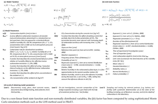 Carbonation prediction model. (a) Mathematical formulations to assess concrete carbonation, (b) limit state function and reliability assessment formulations, (c) their basic variables and (d) the levels of inspection to obtain the respective parameter.