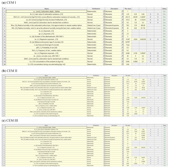 Case studies of model parameters in software FReET used for (a) CEM I, (b) CEM II and (c) CEM III.