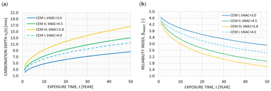 The respective results in terms of the reliability index β are obtained through the limit state function, and they are shown in Figure 5b. For CEM I, the reliability index curve shows a value of β = 2.9 for 50 years. For CEM II/B, it shows a value of β = 1.9 for 50 years, and for CEM III/B, it shows a value of β = 1.59 for 50 years. The initial reliability indices (at year 1) are 4.66, 4.41 and 4.27, respectively. As seen in Table 3, the w/c ratio highly influences the kNAC values, which in turn strongly control the reliability prediction. Assuming that the cement type CEM I is chosen, with a w/c ratio value of 0.6, the kNAC value also increases to 4.0. The results of using this input are presented by the dashed blue line in Figure 5, with the mean value of carbonation depth at 50 years’ exposure time increasing to 11.5 mm and the reliability index decreasing to β = 2.44.