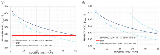 In Figure 6a, the reliability index of the exposure time of 50 years for CEM I and the two alternative kNAC values of 3.0 and 4.0 are presented. It can be demonstrated that, for kNAC = 3.0 (w/c = 0.55), the βREF is reached after a technical lifetime of 50 years. In the case of kNAC = 4.0 (w/c = 0.60), the performance of the structure declines, with the βREF reached only after 27 years of exposure. Similar to the concept presented in Figure 2b, Figure 6b accounts for an assessment of the asset’s conditions through inspections, monitoring or non-destructive and destructive testing. Through this process, the expected service life of the asset can be extended. As illustrated in Figure 6b, this periodic adjustment, in line with the upcoming Model Code 2020, is applied every time the reliability level β exceeds the reference line of β50 = 2.91, for example, at 27 years.