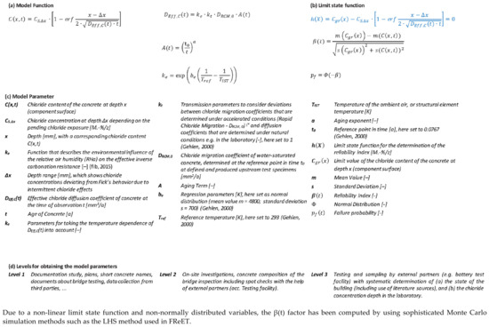 Chloride prediction model. (a) Mathematical formulations to assess concrete carbonation, (b) limit state function and reliability assessment formulations, (c) their basic variables and (d) the levels of inspection to obtain the respective parameters.