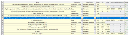 In a similar way to Table 2, Table 7 also provides a general overview of the common default values used in the chloride ingress model function and the following analysis (column ④). Furthermore, the level of inspection for each parameter (column ⑤), the testing methods to obtain each model parameter (column ⑥) and the respective literature source in which the parameters are described (column ⑦) are presented. Furthermore, Table 7 provides the statistical descriptions of certain values (grey-highlighted areas, columns ⑧ to ⑫), such as the distribution type, the minimum and maximum values and each parameter’s first two statistical moments as used in the chloride ingress analysis herein.