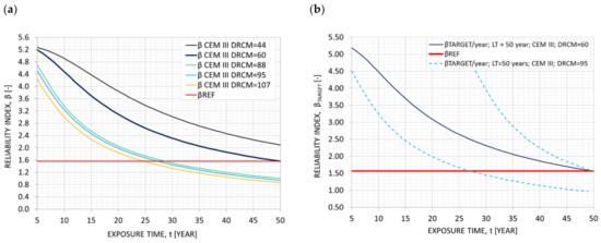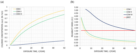 (a) Chloride concentration vs. exposure time and (b) reliability index vs. exposure time of CEM I, CEM II and CEM II for chloride concentration at the reinforcement level of 55 mm, according to [5].