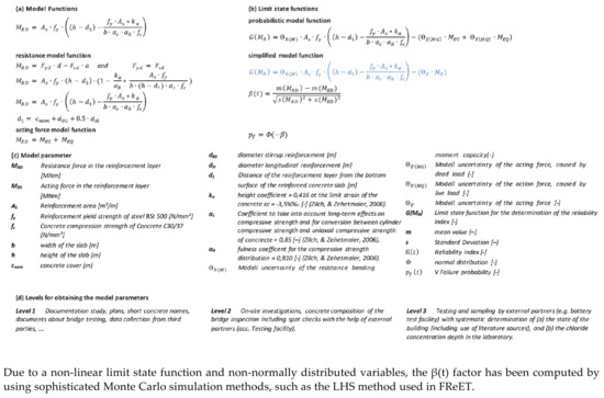 Specifically, Figure 11a shows the basic function of the bearing capacity formulation, along with the complementary functions presented in [44]. The basic bearing-capacity function is transformed to a limit state function (Figure 11b) to be used as a basis for the definition of the β index, according to the classical Basler–Cornell approach, and it can therefore be used to define the failure probability (pf). The necessary input variables, indices and parameters for the function of Figure 11a are presented in detail in Figure 11c. The models presented in Figure 11a,b and their input parameters can be obtained through various inspection levels, as shown in Figure 3d. As already mentioned in Section 4.1 and included in Figure 11 for consistency, a distinction can be made in the form of survey between the Level 1, Level 2 and Level 3 inspections.