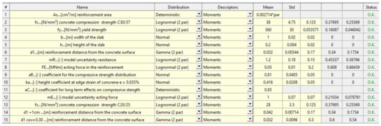 Table 9 gives a general overview of the chosen input parameters that were used in the model function, with the respective literature sources in which the parameters are described. The table also presents the statistical model description of certain parameters (grey-highlighted area). In the analyses, the reinforcement area was taken as a constant variable, and it was multiplied by the parameters in the range of 0.4 to 1 to simulate the loss of reinforcement steel. The analysis was performed with two different types of concrete (C20/25 and C30/37), and for each type of concrete, the distance from the bottom of the slab to the reinforcement was varied between 32 and 42 mm. To calculate the limit-state excess probabilities and subsequently the reliability indices β, the software FReET was used and the first set of input parameters is shown in Figure 12.