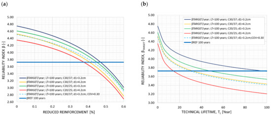 In the baseline assessment and as shown in Figure 12, the COV for the positioning of the reinforcement is set to COV(d1) = 0.17. For a COV(d1) of 0.30, the reliability index without any loss of reinforcement drops to 4.52 (pf = 3.07·10−6), with a notable consequence for the remaining expected service life, as shown in Figure 13a,b (dashed blue line).
