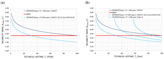 On the contrary, a substandard or bad execution quality leads to lower initial reliability indices and correspondingly reduced service lives. As noted above, the theoretical formulations (Equation (6)) applied and presented in Figure 2a show a decrease in the target reliability from β0 = 4.7 /year to β100 = 3.63 in 100 years for RC2 (dashed line). Assuming the mathematical formulation of Equation (6), this target reliability can be used as a reference for the investigated case. For a substandard execution quality (assumed here as Class 2 according to RVS standards (RVS stands for Richtlinien und Vorschriften für das Straßenwesen)) [14], a reduced initial reliability index of β0,EXC2 = 4.5 can be assumed. In this case, (the amber line in Figure 2a), the reference target reliability of β = 3.63 is already reached at just over 40 years of operation. This indicates a loss of 60 years in the technical lifetime of the asset, already identified immediately after completion of the construction. For a bad-quality construction, a greater reduction in the annual target reliability can be observed, for instance, β0,EXC3 = 4.3.