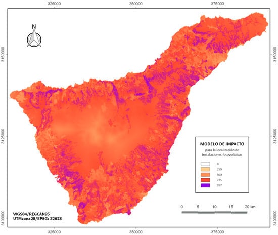 The study aims to develop a method for selecting the optimal location of photovoltaic solar energy installations by means of multi-criteria evaluation techniques [,,], applying it in a concrete way for its implementation on the island of Tenerife. To this end, we worked with a physical planning model based on the analysis and comparison of a series of significant variables or elements, which in a first phase were transformed into suitability criteria for integration into the suitability model by assigning weights to the selected criteria. In a second phase, the Impact variables that influenced the location of solar photovoltaic installations were selected, which, once transformed into criteria and after the assignment of their corresponding weights, would allow the Impact Model to be obtained. These Aptitude and Impact Models were integrated in a third phase, which determined the Hosting Capacity Model, in which, after applying certain restrictions, the optimal alternatives and their geographical location were selected by means of multi-criteria evaluation techniques (EMC).