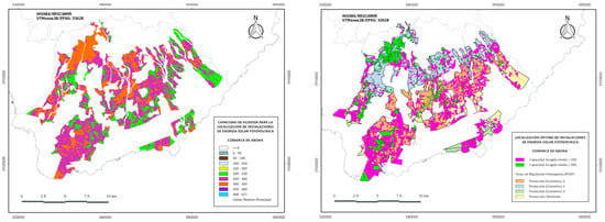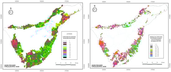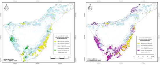 Abona Region: Reception Capacity Map reclassified and adjusted to the limits of the PIOT ARH (left); and Map of optimal locations for photovoltaic solar energy installations (right).