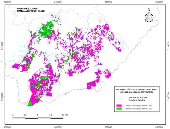 With regard to the cadastral parcel that represents the best locations for this type of facility, and whose HC is at least 250 (parcels in green), the following map was obtained (Figure 7) for the region of Abona: