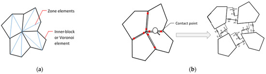 (a) Inner-blocks discretized into internal elements (zones); (b) contact point between blocks.