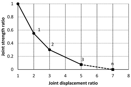 Non-dimensional post-peak weakening behavior defined by linear segments: joint strength ratio vs. joint displacement ratio.