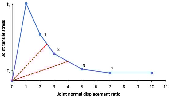 Once the tensile stress exceeds the peak tensile strength, the softening law of Figure 3 is applied as a function of the joint normal displacement until the residual tensile strength, typically zero, is reached. The resulting evolution of the tensile normal stress as a function of the joint normal displacement ratio, shown in Figure 4, is given by: