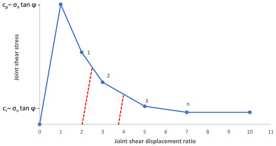 where is the total joint shear displacement. The softening law is applied to the cohesion as a function of the joint shear displacement until the residual state is reached. The shear stress softening curve, shown in Figure 5, is given by: