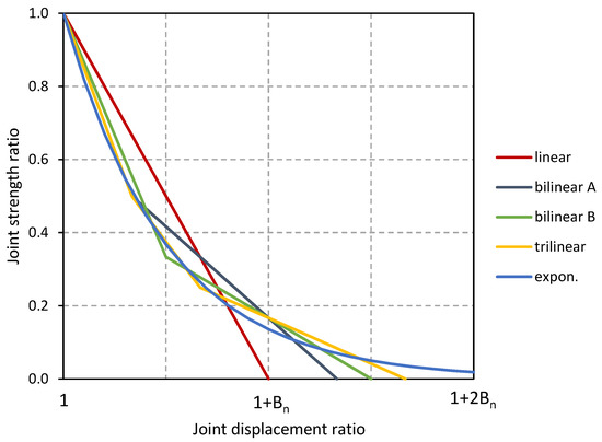 Exponential post-peak weakening curves are often assumed to be a good approximation of the experiments in masonry joints [25,28,41]. This curve shape can be approximated by the piecewise linear framework in various manners. Four types of curves are shown in Figure 6, all with the same fracture energy as the exponential curve, which is also shown: a simple linear weakening law, two bilinear curves, and a trilinear curve. They lead to a better progressive match for the target. The two bilinear curves differ in the value where they reach the residual state. The parameters that provide the energy equality for the four cases are given in Table 1 for the normal direction. The displacement ratio values are a function of the parameter (Bn) and are equal to: