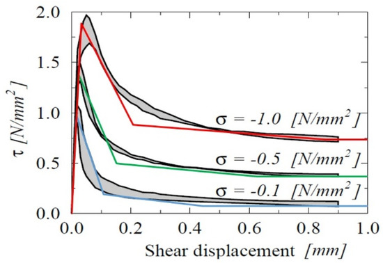 A simple comparison of the bilinear A curve with the experimental results of a shear test under 3 levels of normal stress (Van der Pluijm [42]) is shown in Figure 7, where the fracture energies follow Lourenço and Rots [28].