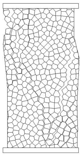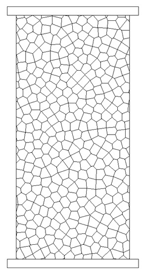 The base model for the calibration tests under uniaxial compression is shown in Figure 8. The numerical sample has dimensions 130 mm × 280 mm. A Voronoi pattern of inner-blocks with an average dimension of 10 mm is generated, creating a system of about 400 blocks. Two rigid blocks are added to provide the boundary conditions.