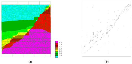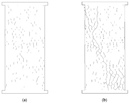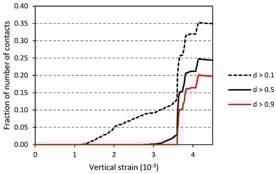 An insight into the progression of the failure process can be gained by monitoring the increase in the damage in the contacts. If we define a damage indicator as the percentage of the loss of strength, starting at 0 at peak and reaching 1 at the residual state, Figure 11 shows the number of contacts with damage greater than or equal to 0.1, 0.5 and 0.90. We can see that small amounts of damage start at low vertical strains and increase slowly. Contacts with damage above 0.5 only start to grow at 3 × 10−3, near the peak. The curve for damage above 0.90 is only noticeable very close to the peak. At peak stress, many contacts reach the residual state (damage of 1), and the number increases rapidly after the peak, denoting a fairly brittle failure mode. Figure 12 shows the contacts with damage levels above 0.9 for two stages of loading, corresponding to vertical strains of 3.5 × 10−3, just before the peak, and 3.7 × 10−3, after the peak. The figures illustrate the process of coalescence of vertical cracks into longer fractures, leading to the axial splitting failure mode shown in Figure 10.