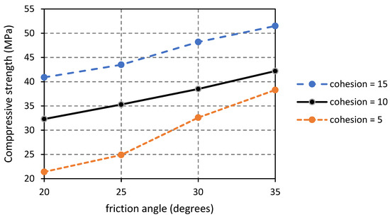 Compressive strength for different values of joint friction angle and joint peak cohesion (in MPa).