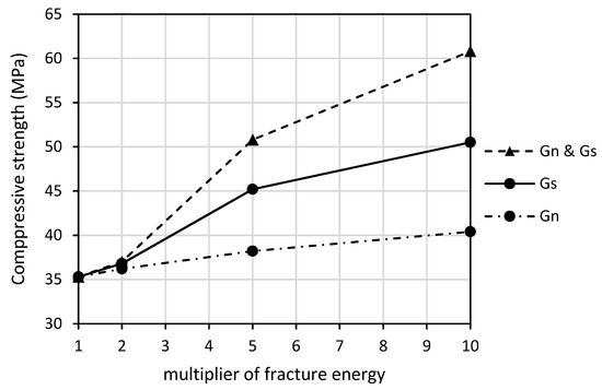The influence of the fracture energies on the compressive strength of the base model sample is depicted in Figure 15. Bilinear post-peak softening was used, as in the base model. Keeping the other parameters unchanged, the fracture energies in mode I (Gn) and mode II (Gs) were multiplied by factors of 2, 5 and 10, both independently and jointly. It may be noticed that the shear behavior has a dominant effect. The tensile failure of the joints is the key to the initiation of vertical cracks, but the path to total collapse is then governed by the shear properties.