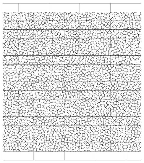 The DEM bonded-block model is composed of discrete blocks, separated by discontinuity surfaces of two types: (i) the real masonry joints and interfaces; (ii) the random network of discontinuities that define the potential cracks inside the units and the mortar. Figure 1a shows the case in which both the unit and the mortar are divided into Voronoi-shaped polygonal blocks, hereafter named “inner-blocks”, which are initially bonded. The real discontinuities in this case are the mortar–unit interfaces. The random cracks are assigned the strength of either the intact material of the unit or the mortar. A simplified version is shown in Figure 1b, where only the unit is divided into bonded inner-blocks. The brick-to-brick joint, which could be dry mortared, is represented by the corresponding joint constitutive model. This option is mainly intended to reduce the computational effort, in cases where the masonry joints have a well-known behavior.