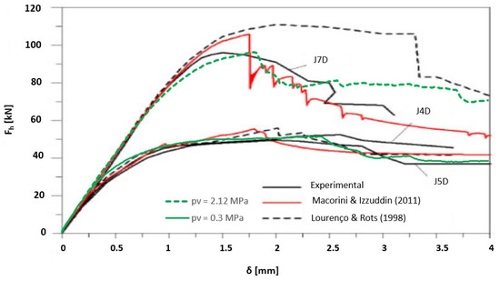 A model with deformable inner-blocks was selected, in which 90% of the unit deformation was accounted for by the blocks and the remainder by the fictitious joints inside the units. The block Young’s modulus was 18.6 GPa, and the Poisson’s ratio was 0.15. The joint material properties, listed in Table 7, follow the data provided by Vermeltfoort and Raijmakers [45], as well as additional data used in the numerical simulations by the researchers cited above [28,29]. In particular, the tensile and cohesive strengths used for the mortar joints in the tests with different vertical stresses, as well as the fracture energies, follow Macorini and Izzuddin [29]. The post-peak weakening assumed a bilinear shape, as in the bilinear A option in section above.