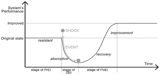 From the perspective of the event occurrence, CIs resilience is a refocus from protection to adaptation and recovery of a system. Based on the theory of Ouyang about the temporal stages [31], TIs resilience indicators are categorized as pre-event indicators (PrEI), during event indicators (DEI) and post-event indicators (PoEI). In our study, the event is defined as the occurrence by which a shock causes maximum impact to transport system’ performance (see Figure 1):