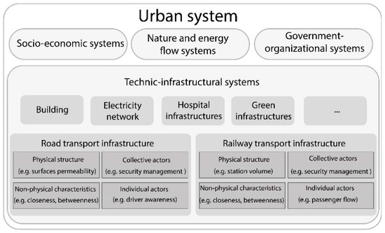 In comparison with these definitions, this research highlights the interdependences between TIs and other related systems. In the conceptual urban system, TIs are part of CIs, which are a significant portion of urban systems [36,37,38]. Moreover, TIs can be divided into a series of component systems (see Figure 2). For example, the function of a road transport system relies on all its components, such as the regulatory system, the drainage system, the maintenance system, etc. [36]. TIs resilience is connected to the function of all relevant systems. The interdependence makes all urban systems interact with and influence one another. This study considered not only the capacities of one system but also the relationships between relevant systems. Consequently, this study suggests defining urban TIs resilience as the ability of a transport network to manage multiple-equilibrium with other urban systems, to resist and absorb all shock events, to maintain and restore rapid functions whatever disruptions, to learn and improve capacity to cope with future risks.