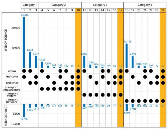 The result is shown through the state of the art (see Figure 3). The orange part (row 10, 17, 24) is the search work mentioned above (Table 2) and discussed in Section 4 and Section 5. Only a small proportion of studies on urban resilience (row 2) or urban transport (rows 4, 11, 18) are related to the resilience of urban transport (rows 8, 15, 22). In addition, less than 2 in 1000 studies on resilience indicators (row 3) are relevant to TIs (row 9). Overall, the studies on resilience indicators for TIs account for only about 3.7 per 1000 urban resilience studies (row 2).